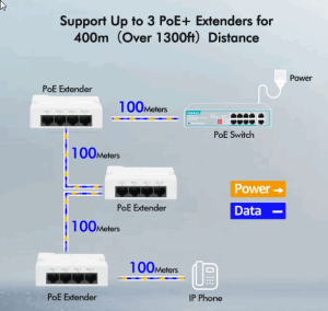- Có thể mở rộng thêm 330ft(100m) truyền dữ liệu PoE+ thông qua bộ lặp YuanLey PoE. Và nó hỗ trợ xếp tầng 3 cấp độ, do đó, nó có thể truyền dữ liệu PoE lên đến 1312ft với 3 bộ mở rộng PoE.