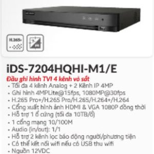 Thông số kỹ thuật đầu ghi hình 04 kênh Turbo HD 4.0 Hikvision DS-7204HQHI-K1/E